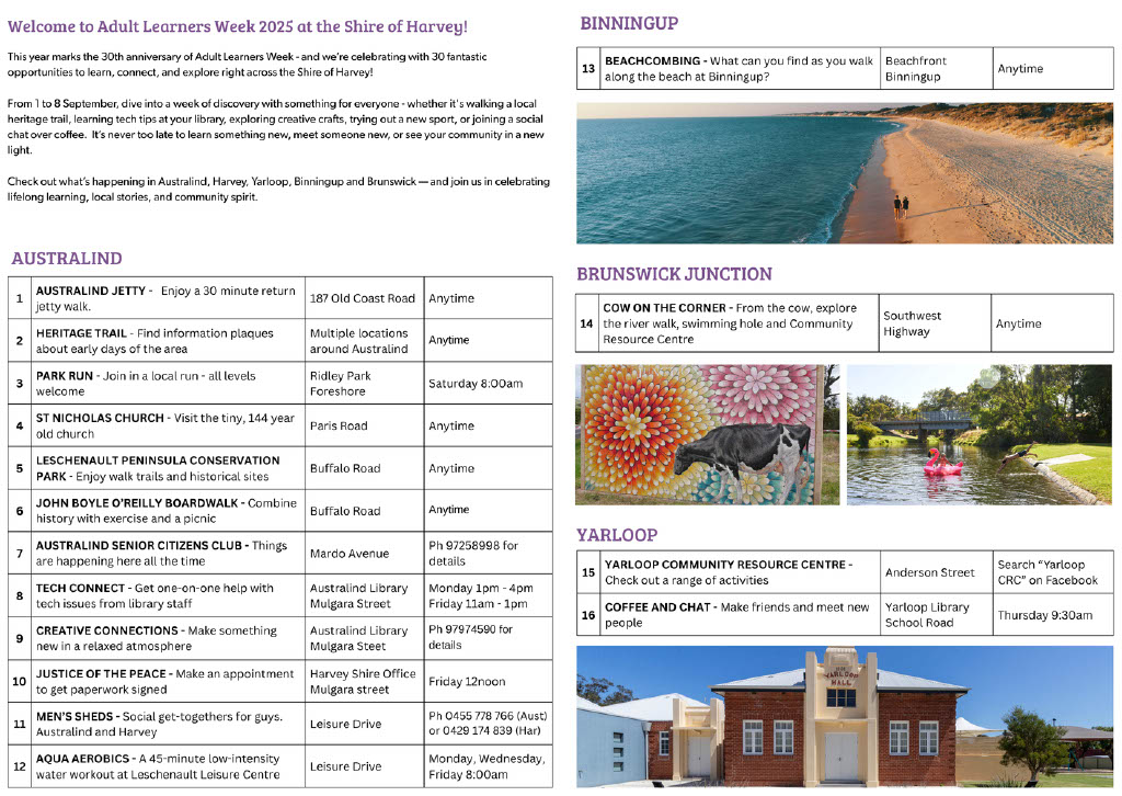 The Shire of Harvey ran a program of 30 events for 30 years of Adult Learners Week. These ranged across locations and included events around tech help, health, wellbeing and community.